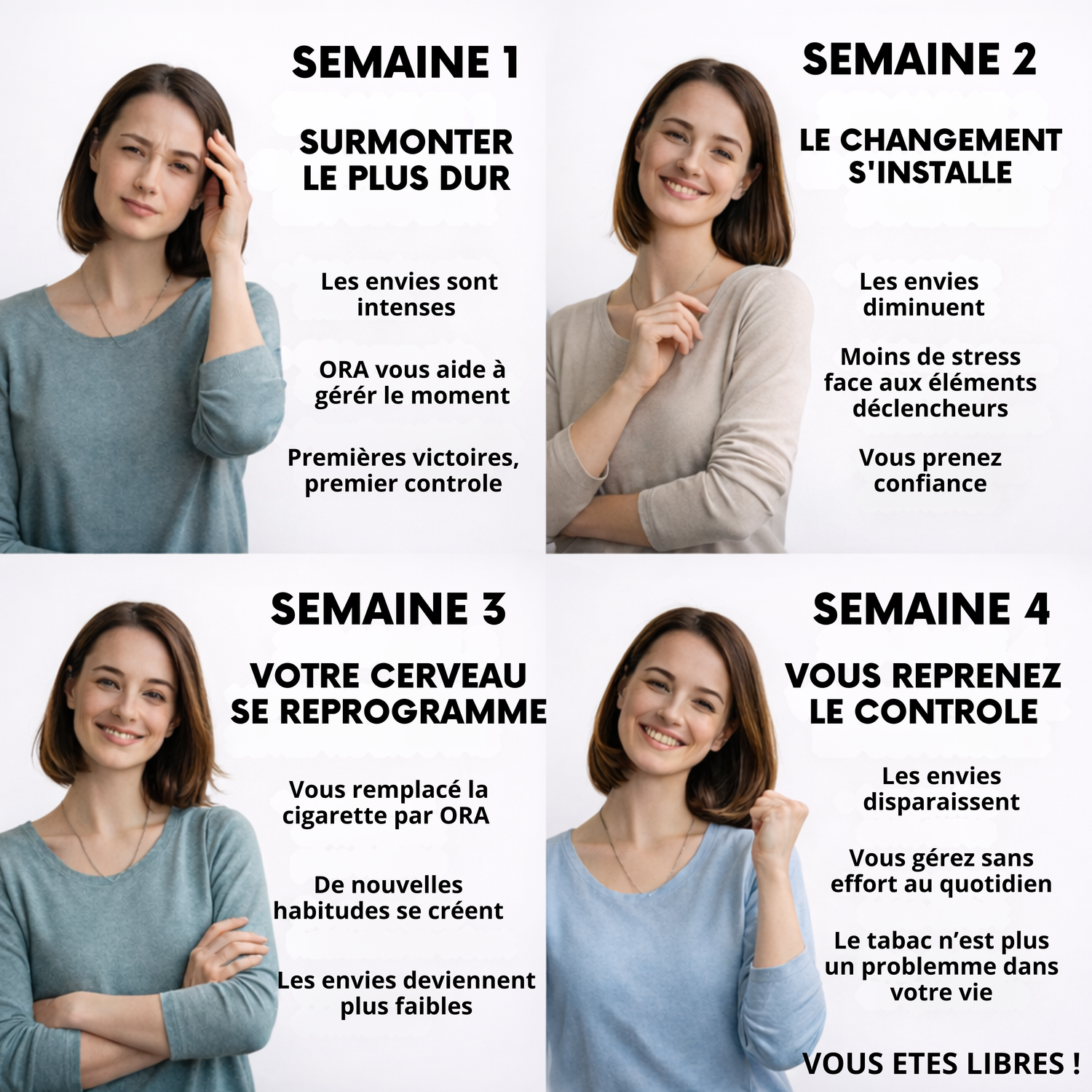 Ora vous accompagne, étape par étape, pendant 4 semaines pour vous aider à reprendre le contrôle.